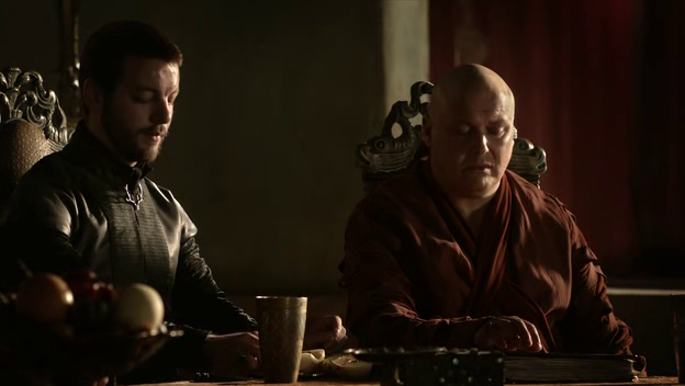 Renly and Pycelle look the same as before, but Varys has gotten a total costume change for this scene. He's gone from his green botanical print last time, to a solid red here. I don't know if it "means" anything exactly, but it's interesting that he'd get a whole new costume in a relatively short space of time.